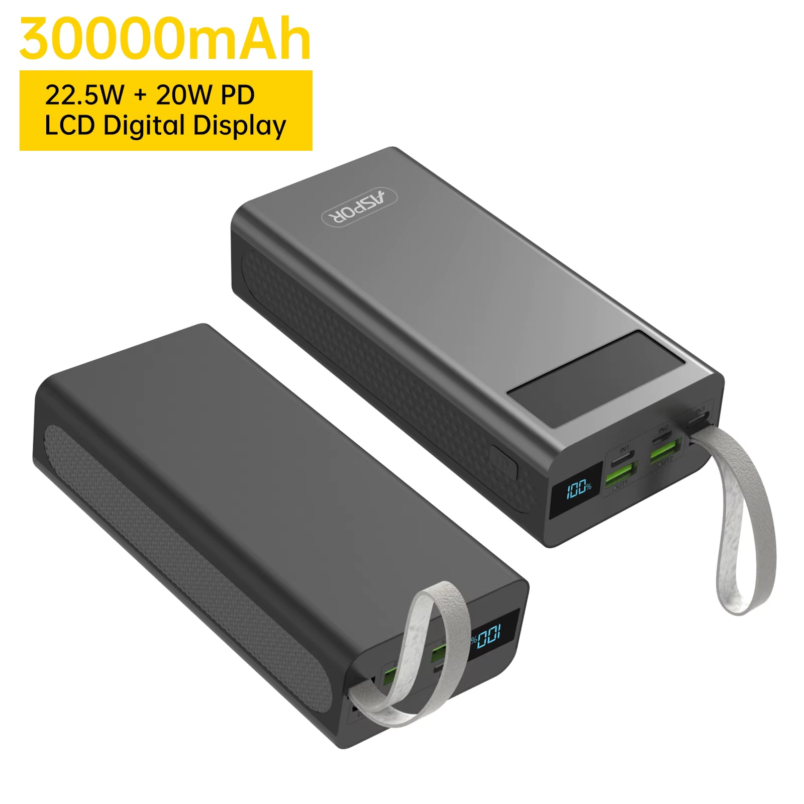 ASPOR A306 30000mAh Power Bank with LCD Display – 22.5W Fast Charging